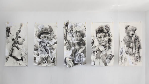 Drawing paper, graph paper, magazine paper, prints, charcoal, gesso, matte glue, tapes on on Strathmore paper